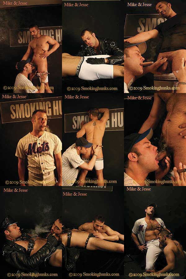 Mike is trying out his new camera, Jesse comes home and asks him what's up? Mike says it would be easier if he had a model. Jesse jumps right in and starts to pose. Mike keeps snapping photos. Pretty soon, Jesse says, "I know what kind of photos you want, give me a cigar". It's hard for Mike to conceal his bulge in his white underarmour shorts. Pretty soon they both start kissing and swapping smoke. After a few blow jobs, Jesse says, Hey take some pictures of me in leather. The photos are so hot that Mike's ass is starting to twitch and soon enough Jesses is pounding Mike's ass and smoking his cigar like a chimney.